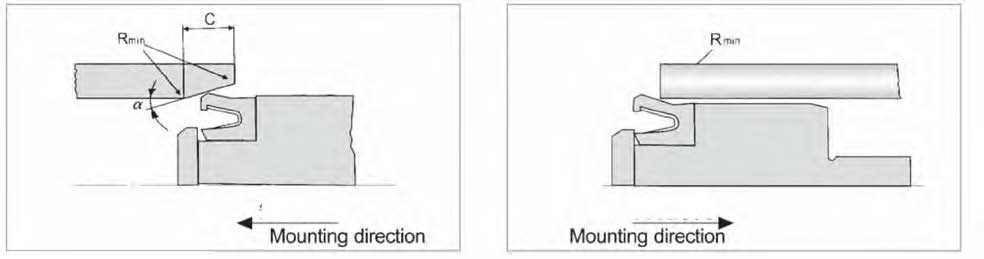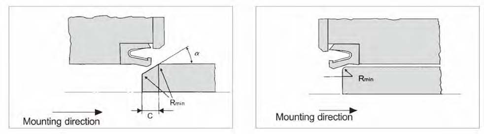 Installationfor installation in open grooves Assembly of rod seal in open groove. Sealing lips in mounting direction. Values for lead-in chamfer: see table below. All edges rounded. We recommend: Rmin...