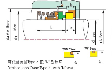 Replace John Crane Type 21 with N seat Operating Limits: Pressure: 0~1MPa Speed: 13 m/s Temperature: -30℃~+200℃ Rotary Ring(Carbon/Sic/TC) Stationary Ring(Ceramic/Sic/Tc) Secondary Seal(nbr/Ep...